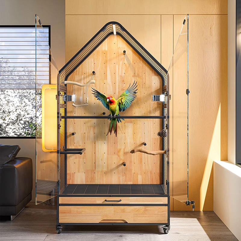 Questa gabbia per uccelli in legno innovativa, con una cornice in acciaio al carbonio come scheletro, legno di gomma importato come telaio e una porta di vetro temperato panoramica, non solo mostra la bellezza naturale, ma realizza anche l'allevamento scientifico per uccelli. Dalla protezione della sicurezza alla comoda pulizia, dalle attività gratuite alla vita comoda, ogni dettaglio mostra una profonda comprensione delle abitudini degli uccelli, consentendo agli amanti degli uccelli di mostrare pienamente la loro natura naturale in un ambiente sicuro e confortevole, portando un'esperienza di visione coinvolgente al proprietario. .